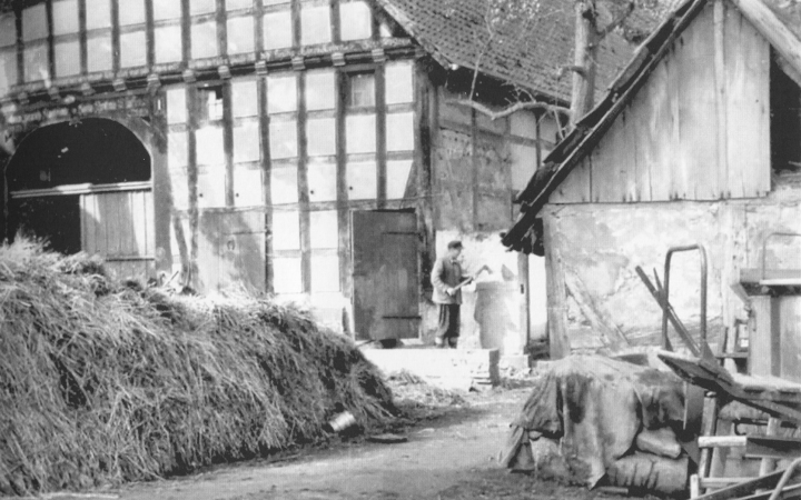Ich beginne mit dem Vollmeierhof Nr. 1, etwa 120 Morgen groß, der seit dem Jahre 1950 von Helmut Sahlfeld und Ehefrau Ilse, geborene Haasemann, bewirtschaftet wird. Erstaunlicherweise gehen hier die Aufzeichnungen über die Ahnenreihe bis zum Jahre 1640 zurück, was einer fast 350jährigen Familienchronik entspricht. Ferner war nach den zweihundert Jahre alten Inschriften am großen Eingangstorbogen in Erfahrung zu bringen, dass Johann Heinrich Kerkmann, der Jüngere, im Jahre 1780 das jetzige Fachwerkhaus und die Scheune bauen ließ. Als der Hof um die Zeit nach 1860 vom Bürgermeister Eduard Haasemann bewirtschaftet wurde, drohte seinem Hof die Gefahr, zwangsversteigert zu werden.