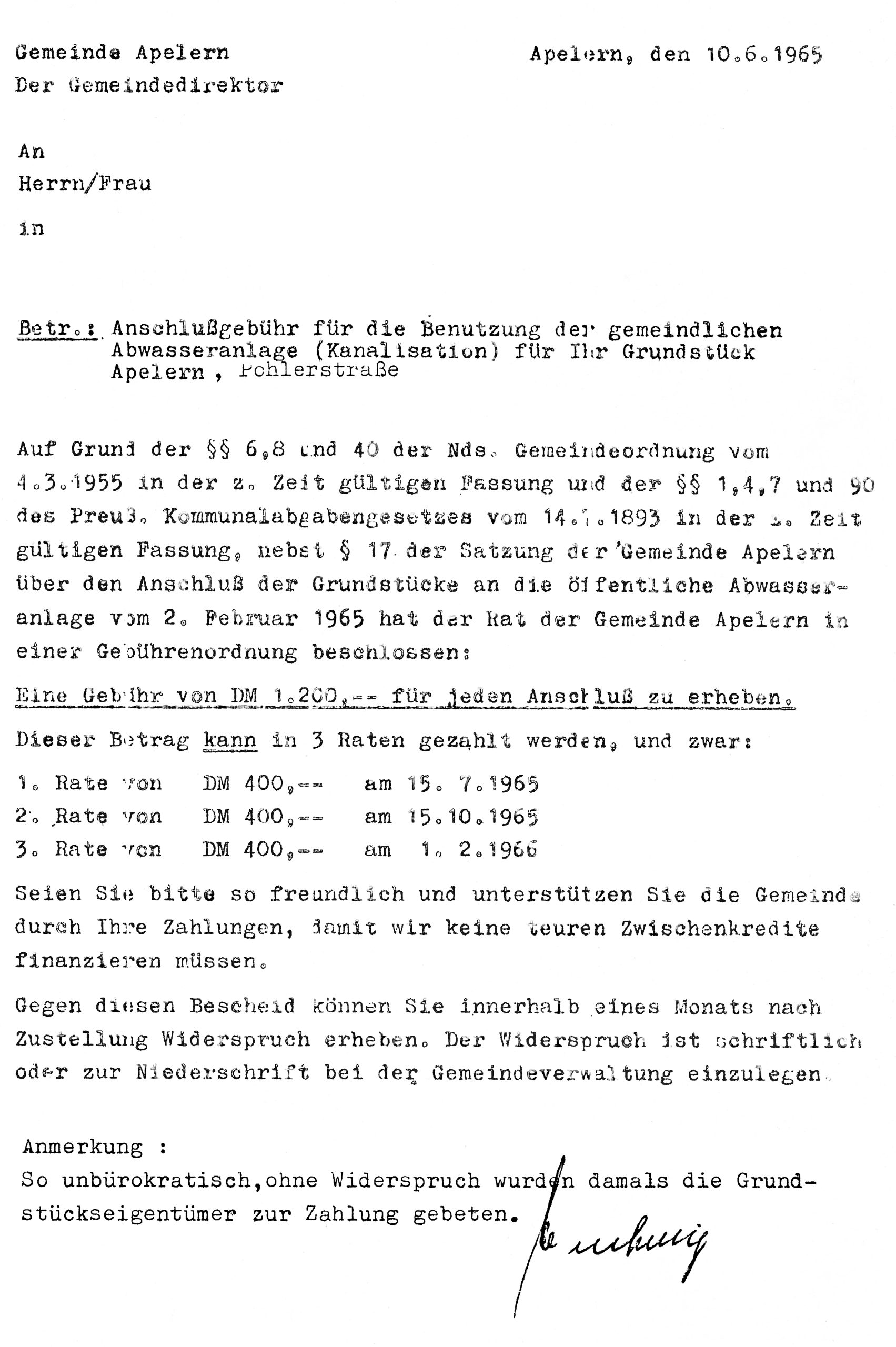 Bis zum heutigen Tage lief die Anlage, einschließlich der Kläranlage, ohne nennenswerte Störungen und Unkosten. Ich befürchte allerdings jetzt, dass das Schicksal unserer gut funktionierenden Kläranlage bald besiegelt sein wird; denn die Samtgemeinde Rodenberg ist dabei, in unmittelbarer Nähe ein riesiges Klärwerk zubauen. Die Apelerner Bürger richten ihr Augenmerk aber nicht auf die Größe einer Anlage, sondern auf sparsames Wirtschaften. Sie sind mehr daran interessiert, dass die Schmutzwassergebühren nicht in den Himmel wachsen. Weil die öffentlichen Haushalte keinen Goldesel haben und in die Taschen der Einwohner greifen müssen, müssen sie darauf bedacht sein, mit Steuern und Abgaben sparsam umzugehen.